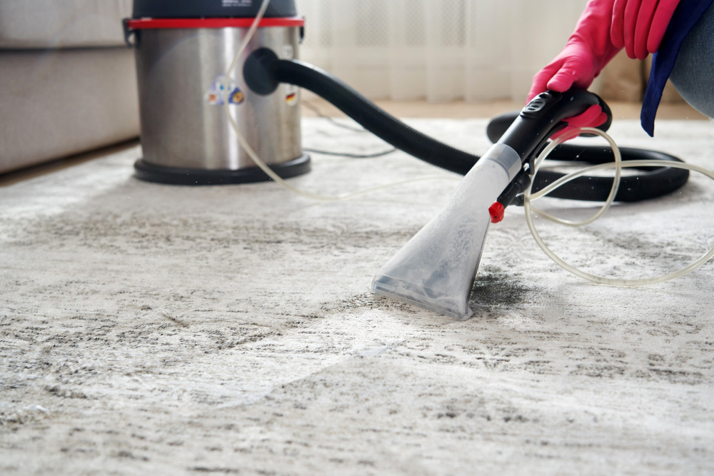 Happy cleaner cleaning sofa with professional equipment flat vector illustration