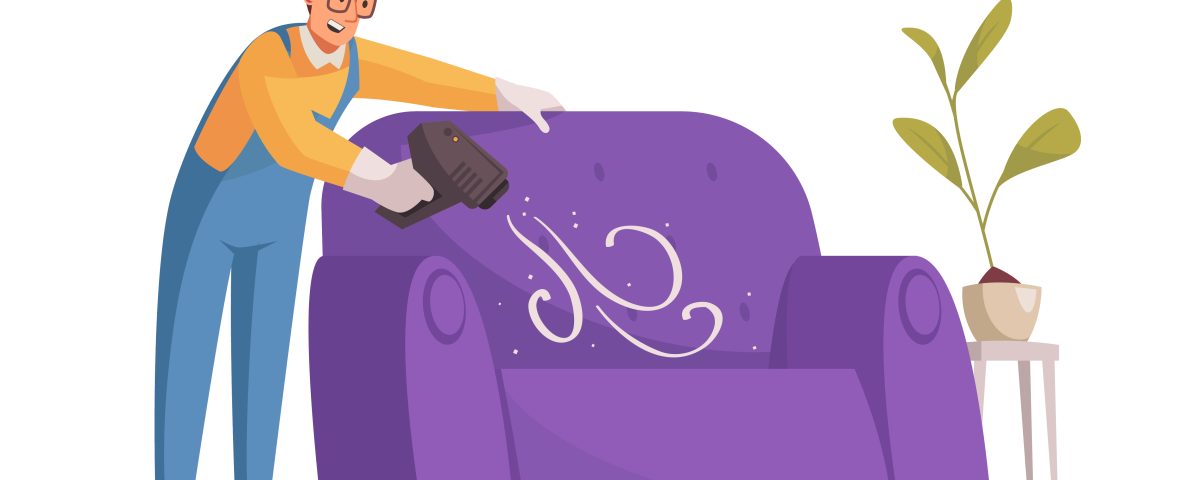 Happy cleaner cleaning sofa with professional equipment flat vector illustration